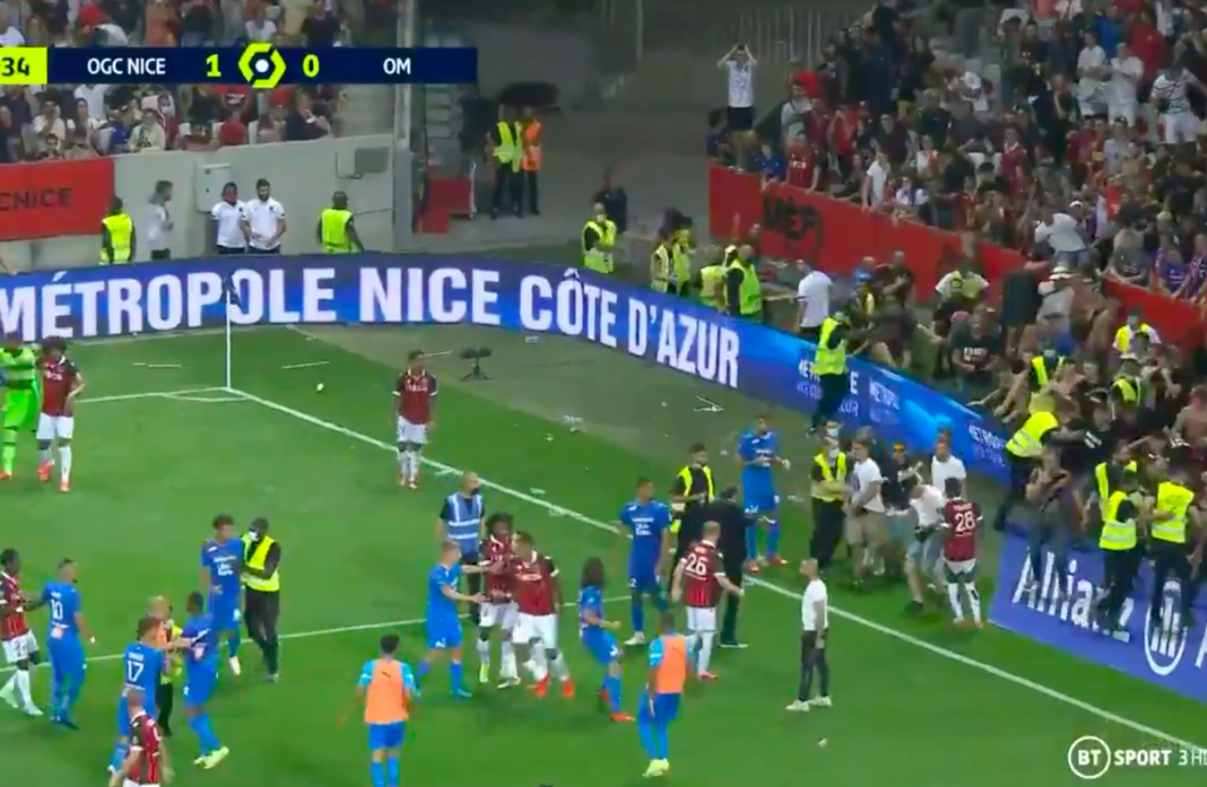 Chaos erupted at a ligue 1 soccer game in france between nice and marseille after fans jumped over the barrier and engaged in a scary brawl with players and stadium security. Sunday's contest was suspended and then abandoned after. The ligue one match between nice and marseille was abandoned on sunday after some supporters invaded the pitch at the allianz riviera in france. Nice and olympique de marseille have been summoned to a disciplinary hearing on wednesday after their ligue 1 match on sunday had to be abandoned due to crowd trouble, said the french professional league (lfp). Nice and marseille have been summoned to a disciplinary hearing on wednesday after their ligue 1 match on sunday had to be abandoned due to crowd trouble, the french professional league (lfp) said.